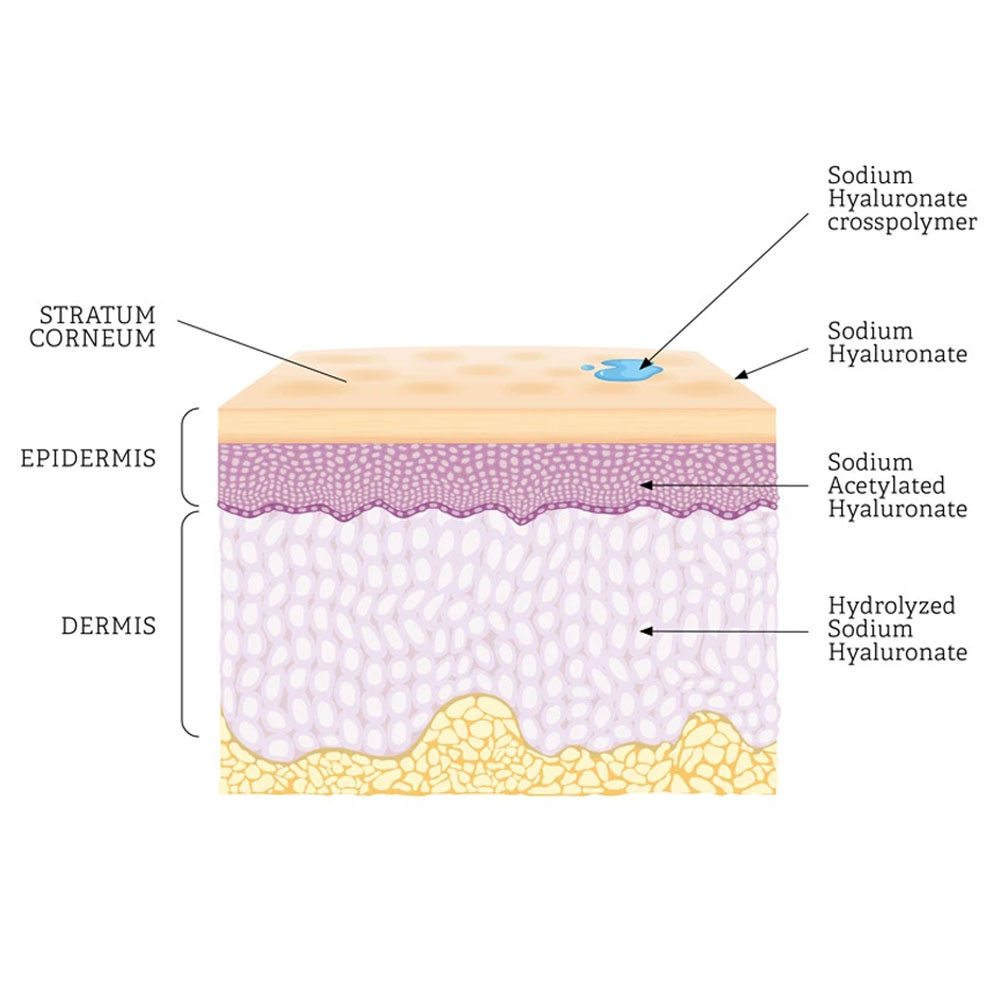 Sodium Hyaluronate е всушност облик на хијалуронска киселина во форма на сол со подобра стабилност, односно отпорност на оксидација. Главната предност на оваа форма на хијалурон е малата молекулска маса која овозможува подобро продирање во кожата. Помага да се задржи водата во кожата, длабински ја храни и и дава исполнет ефект со што последователно се намалува видливоста на брчките и фините линии на кожата.