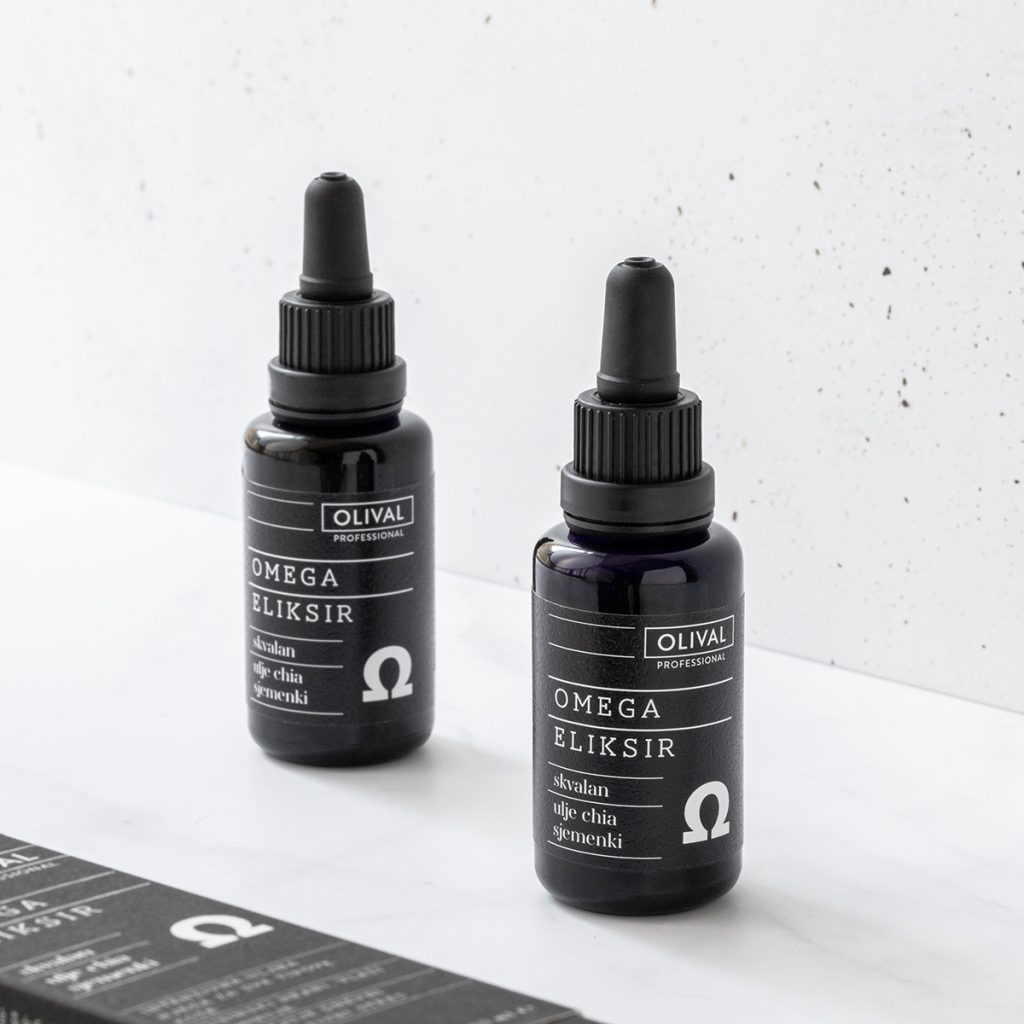 Како извонредна опција за маслен комплекс се истакнува Оливал Омега Еликсирот, производ богат со омега 3 и омега 6 масни киселини. Станува збор за комбинација на масло од чиа семе со сквалан добиен од маслинки (сроден со природната масленост на кожата), масло од семки од капина, авокадо и ноќниче. Токму поради специфично формулираниот состав, ова масло е погодно за нега и длабинско хранење на сите типови на кожа, додека поради различните начини на аплицирање можете да го прилагодите според вашите моментални потреби.