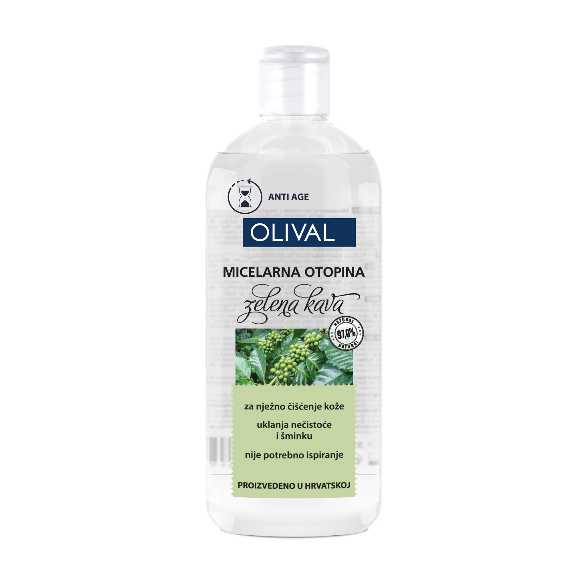 Мицеларниот раствор со зелено кафе нежно ги отстранува нечистотијата и остатоците од шминка од лицето и вратот и областа околу очите. Пенетрира во сите вдлабнатини и брчки на лицето. Екстрактот од зелено кафе долгорочно ја враќа природната влажност и рамнотежа на кожата и го освежува тенот.